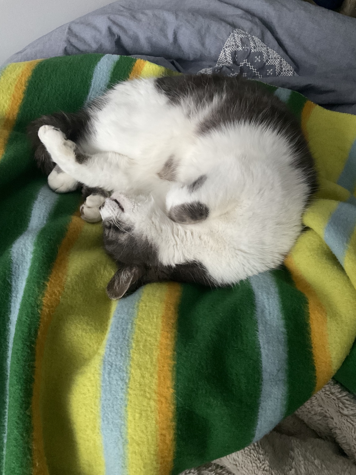 ベッドでもみもみ中に外に鳥さんか見つけたもんで、小さくうーっと言うて、机の上に駆け上がったよ。