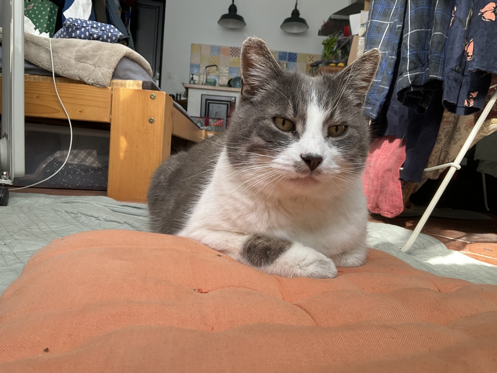 布団の中に来て、ねーこの右腕を枕にしてくれとってん。左手で毛をなでとったら、何か小さいものがくっついとったもんで、引っ張って取ったら、どうやら動く虫やった。仕方なく布団から出て外にほったわいね。