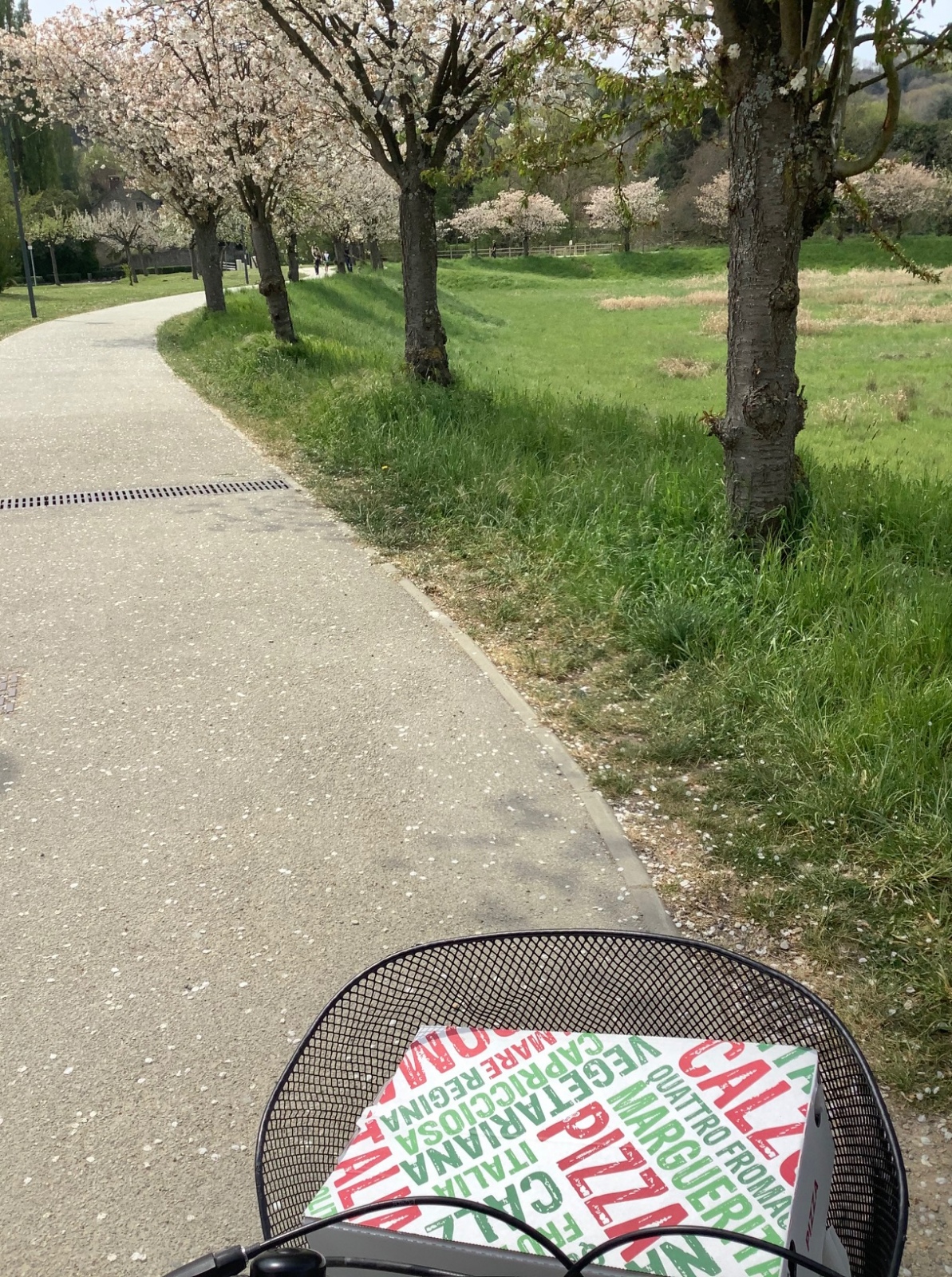 かごの中にはピザ 市の仕事で、クリスマス時季に書道のアトリエをした時に、お昼ごはんを用意してくれてん。一日目は機内食よりおいしくない弁当が出て、二日目は市役所近くのピザ屋さんで調達してくれてん。それがたいそうまーかって、いつかまた食べようと思っとったのが、今日になったよ。