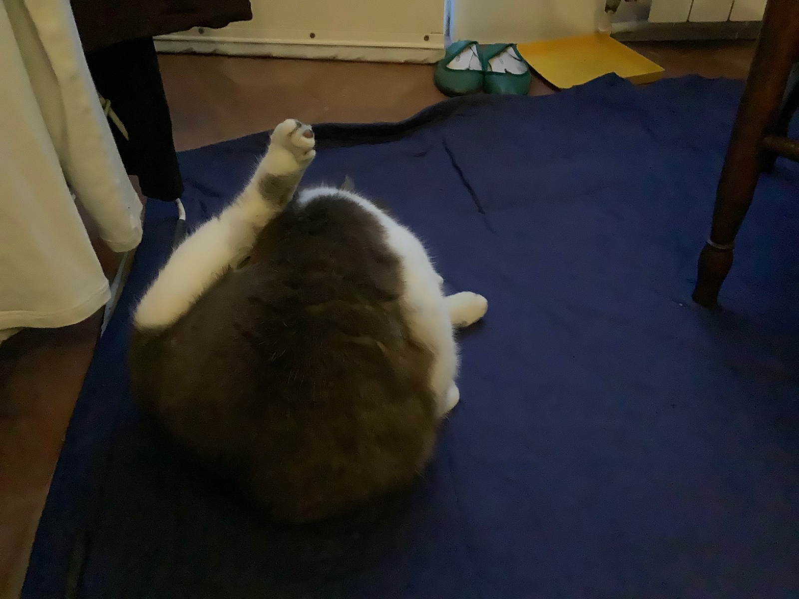 けんか後? 道の方から猫のけんかの声が聞こえたもんで見に行ったら、よその家の敷地に走って入る猫の影。猫ちゃんかわからなんだけど、入るわけにいかんからそのまま帰った。また見に行こうとしたら、ちょっと抜け毛の猫ちゃんがちょうど庭におって、一緒に家の中に来た。