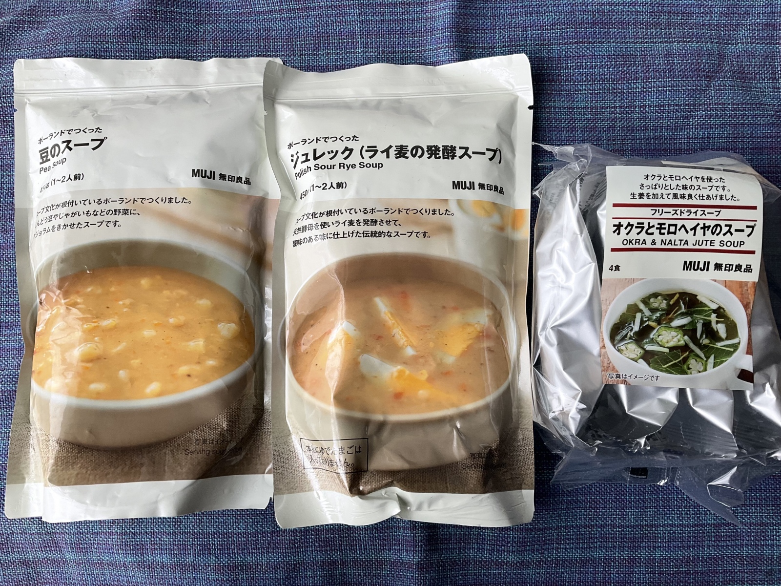 無印のスープ オクラとモロヘイヤのスープは賞味期限が近くて半額。これうまいげんよね。豆のスープは塩が強い気がするけど、まーかった。もう一つのスープはこれから。写真みたいにゆで卵は入ってないと書いてある。