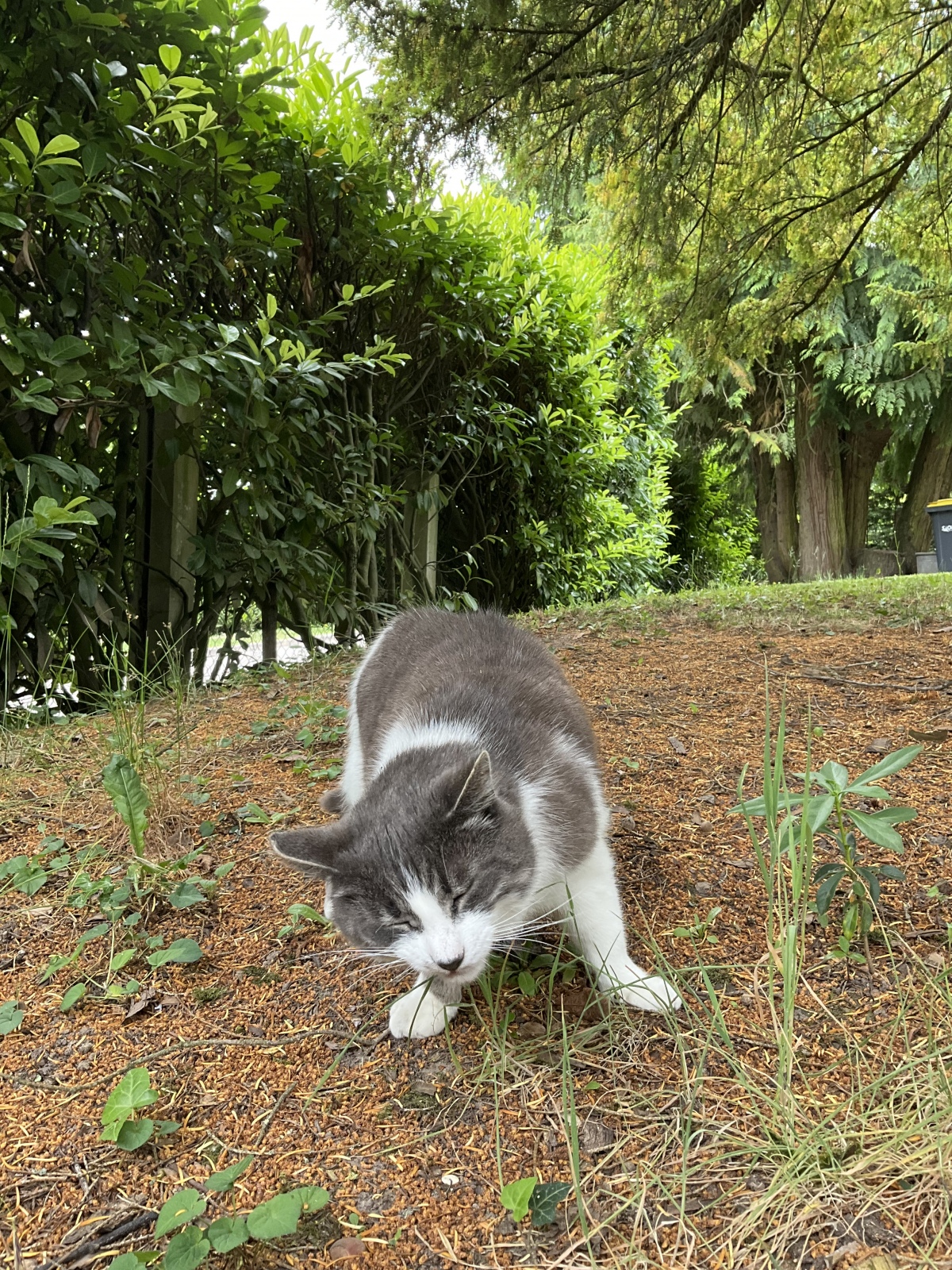 むしゃむしゃ草を食む猫千代 お腹すっきりさせてね。おらは昨日のお昼のファラフェルサンドが効いとるんか、独特なにおいがお尻から発生しとるわ。ベジタリアン食材だけねんけどなー。他のものかな、とにかく931。