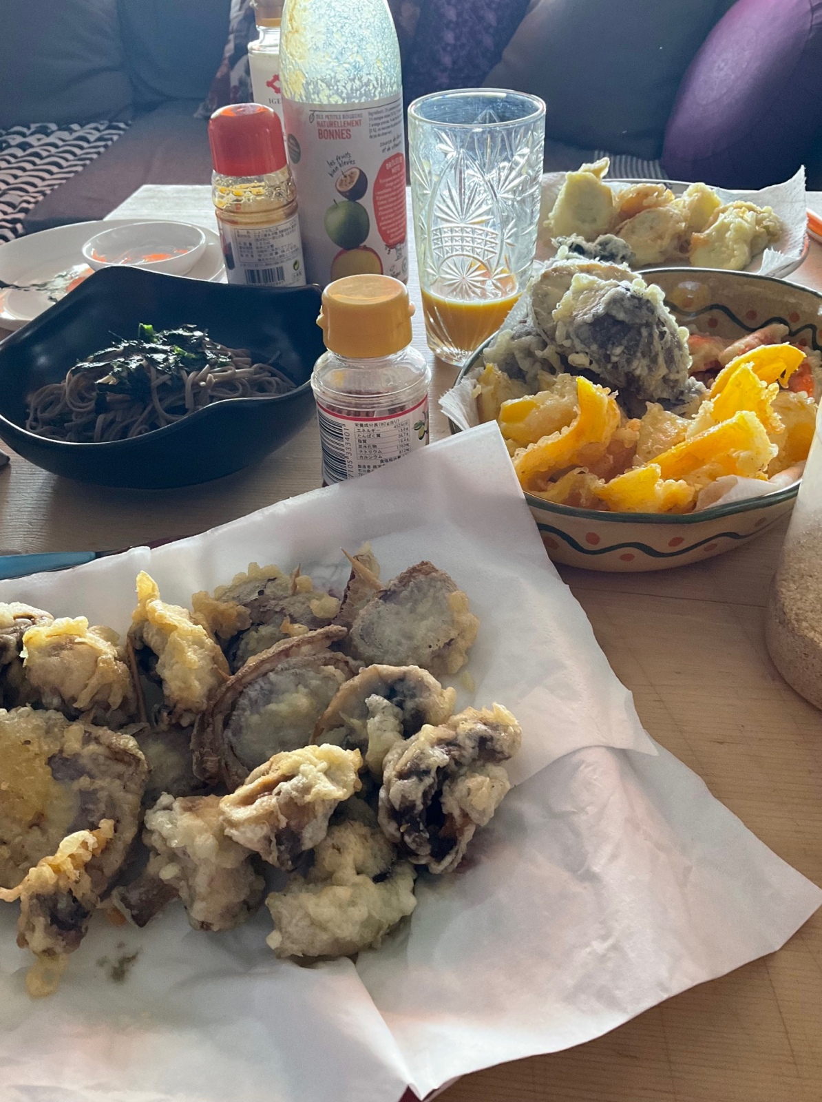 にんじん、黄パプリカ、なすび、マッシュルーム、黄ズッキーニ、紫玉ねぎ、スリミことかにかま、海苔。