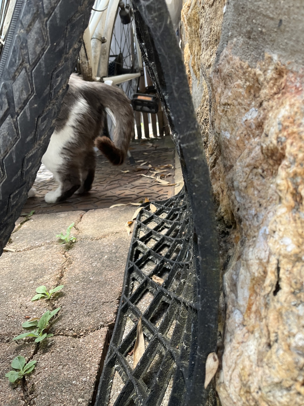 部屋におらんなと外を見たら、自転車の陰におったわ。起こしてもうた。