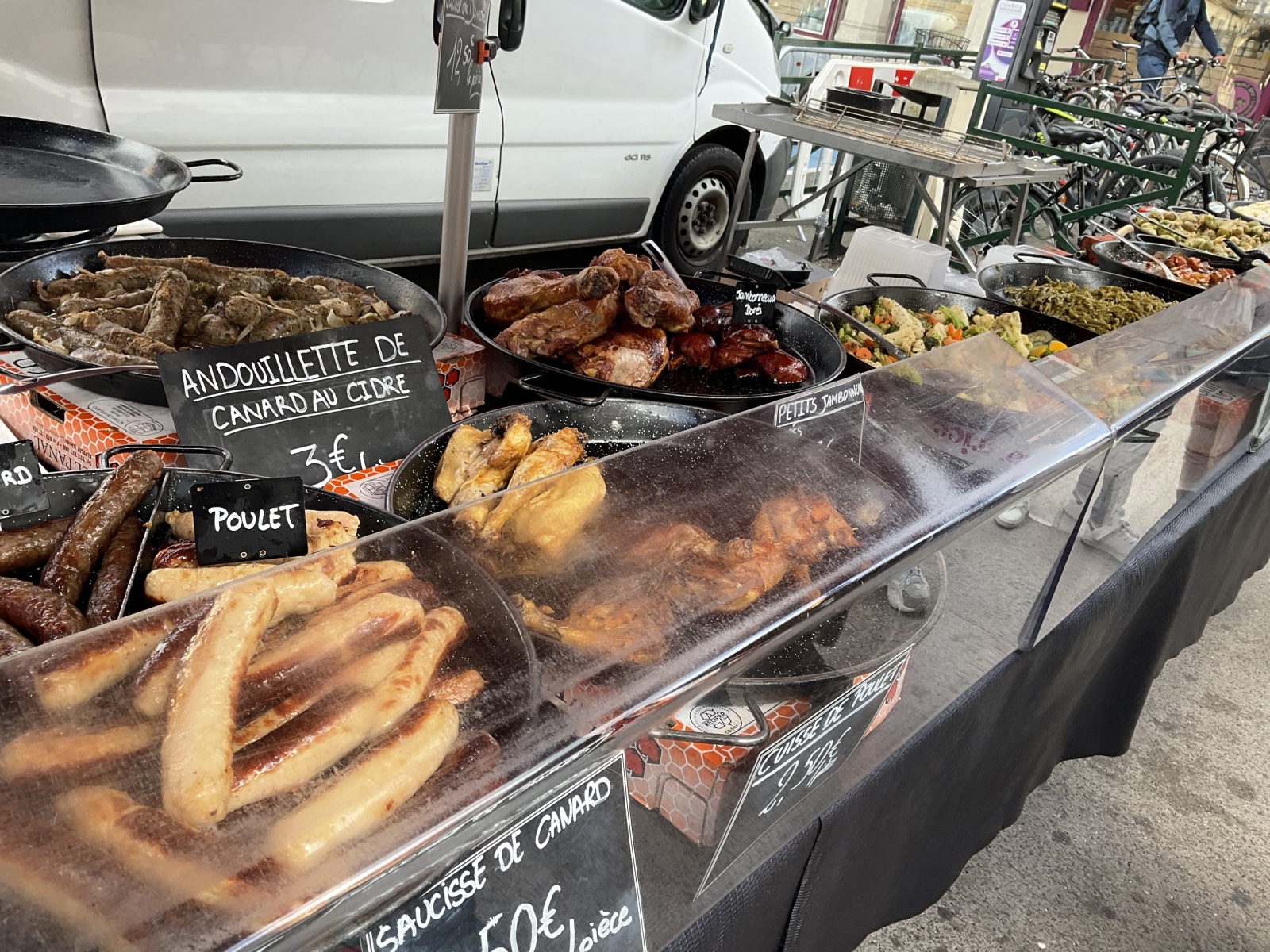 去年も来ました またソーセージのアンドゥイエット(アンデュイエットと呼んどった)と、じゃがいものグラタンを買ったよ。ラタトゥイユがおいしそうで、あと少しやったのを買おうかなと思ったら、後ろのマダムが興味ありそうな声が聞こえてきてん。自分の番になって、残りの量を確認すると、やっぱり一回分の容器の量しかない。半分でもいいかと聞くと、お店のマドモワゼルは、値段の割引はせんと。迷ってんけど、一応マダムにいるかと聞いたら、まあいいと言うから、遠慮なく買わせてもらったよ。
