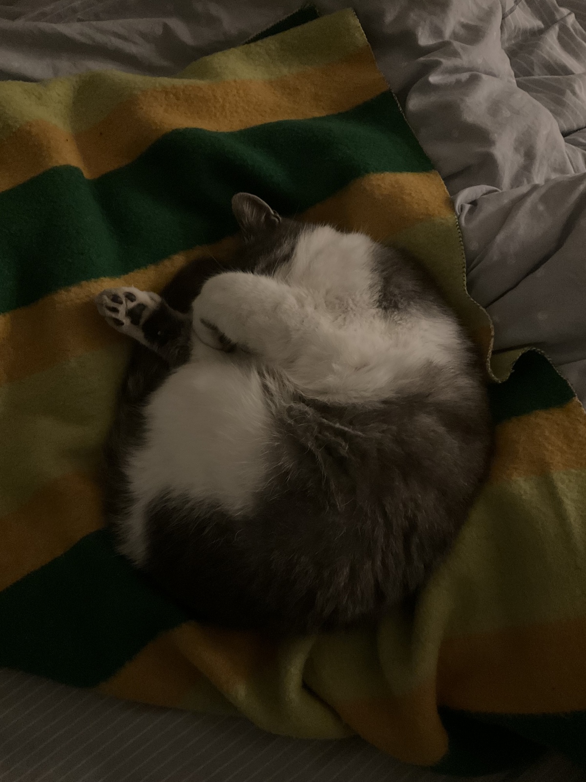 10月3日(金) 夜中のおねむありがとう 猫千代は4時間以上ねむねむしとったわ。うち2時間は、ねーこを腕枕にして一緒にねむねむ。夜中の2時に起き出して、のどを潤してから勢いよく夜勤のお庭番に出かけてったよ。