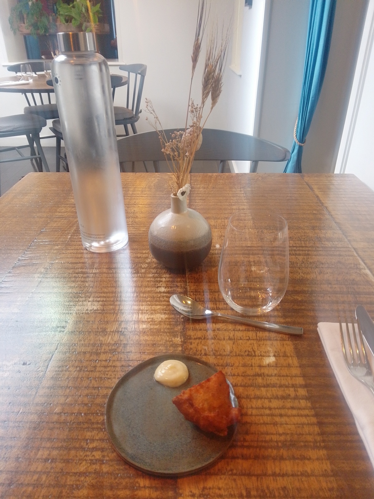 10/4(土)のお昼ごはん アミューズ・ブーシュ その一 毎年呼んでもらえる出張アトリエの前のお楽しみ! 格別おいしいレストランで恒例のお昼を食べたよ。メニューには載ってないけど、前菜の前にも出てくるげん。すり身の揚げたみたいのやったわ。燻製風味のマヨネーズを添えてあった。