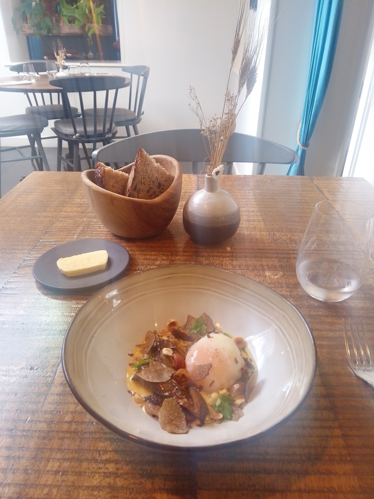 前菜 「64の卵」使用と書いてあったから卵の特別な品種と思ったら、調理温度…と今知った。温泉卵のようにとろとろやったわ。ミモレットチーズのクリームに、セップ茸、平茸、さらに地元のトリュフが入っとったって。