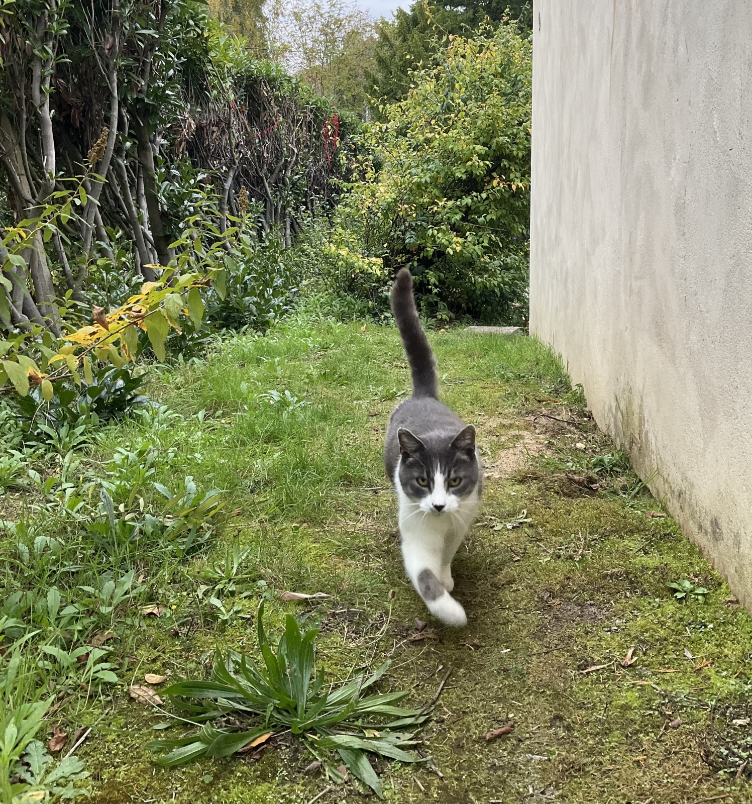 ほーら あの子がかけてくる♪ (ハイジの歌) お稽古から帰って、猫千代のお家の庭に呼びかけたら、ちょうどおったみたいですぐ来てくれたよ。先にねーこの住まいの方へ走ってったけど、戻ってくるところを撮ろうと思って、ねーこはカメラを構えて待っとってん。