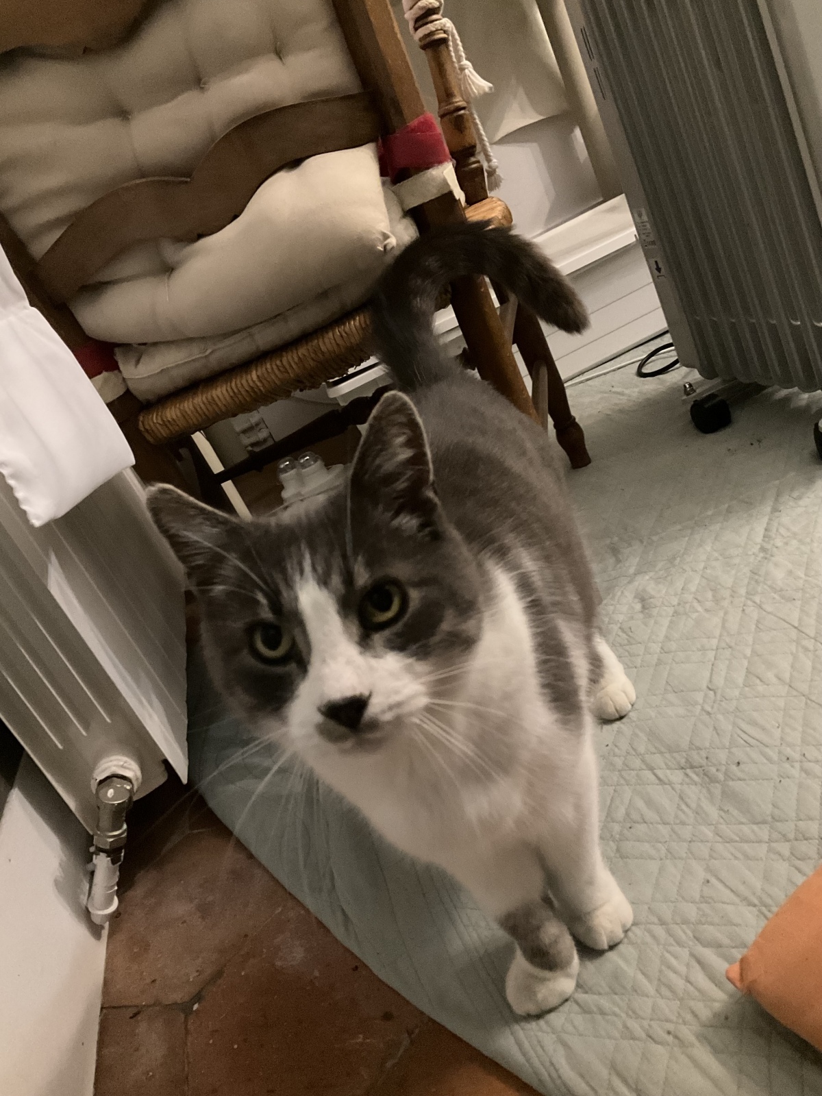 出迎えありがとう 今日の帰りの乗り換え駅で、前の大家さんの娘さん(金曜日とは別の娘さん)に会ったよ。だいたい毎朝7時の電車に乗って、夕方6時くらいに帰るらしい。このふたりの娘さんたちには、いつも年賀のメールを送っとるげん。うれしい気持ちで帰ってきて門を開けたら、猫千代がニャーニャー呼ぶ声が聞こえて、またうれしい。駅で降りてからスーパーに寄るつもりやってんけど、猫千代とふれあいできたから、それで良し。