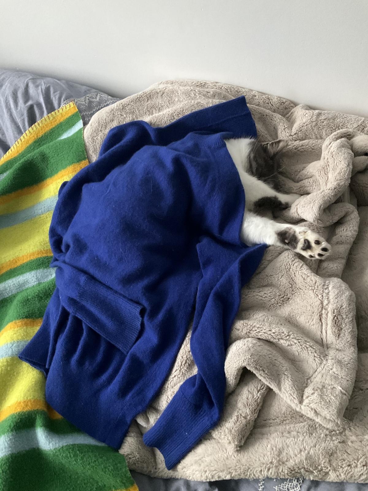 カシミアのセーターも気に入っとると飼い主さん夫妻に書いたら、甘やかしとると両方から返事が来たわ。そうかなあ。古いセーターねんよ。