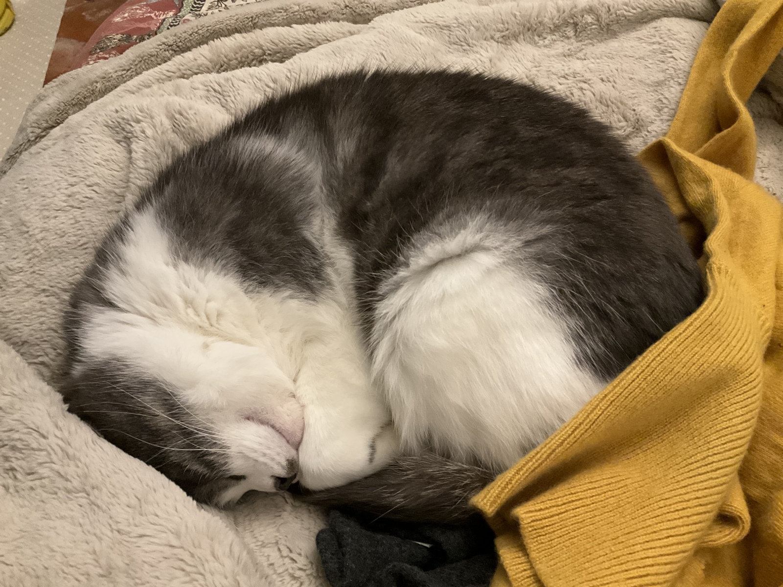 寝返りをしたら、掛けてあるセーターが敷き毛布になったりずれたりするもんで、その都度別のセーターを掛けたり、掛け直したりするねーこです。