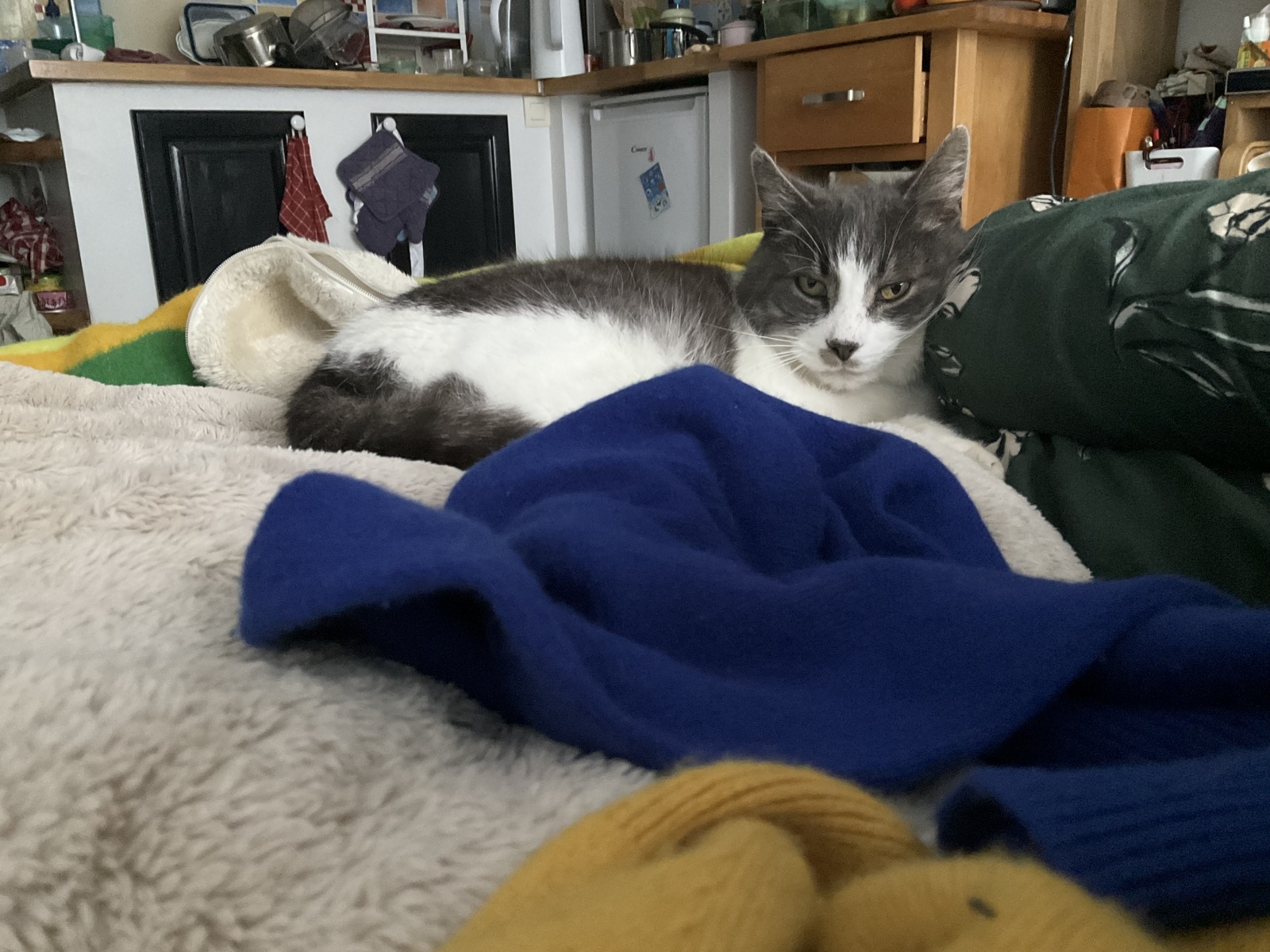 1月2日(金) いらっしゃい 雨、雪も降った寒い中、あんよに泥をつけて来てくれたよ。体を拭くのはあんまりやーがらんけど、足を拭くのに構えたら怒って飛びかかって来たわいね。それからおやつ少し、もみもみのあと、ねーこのひざを枕にして昼寝が始まったよ。