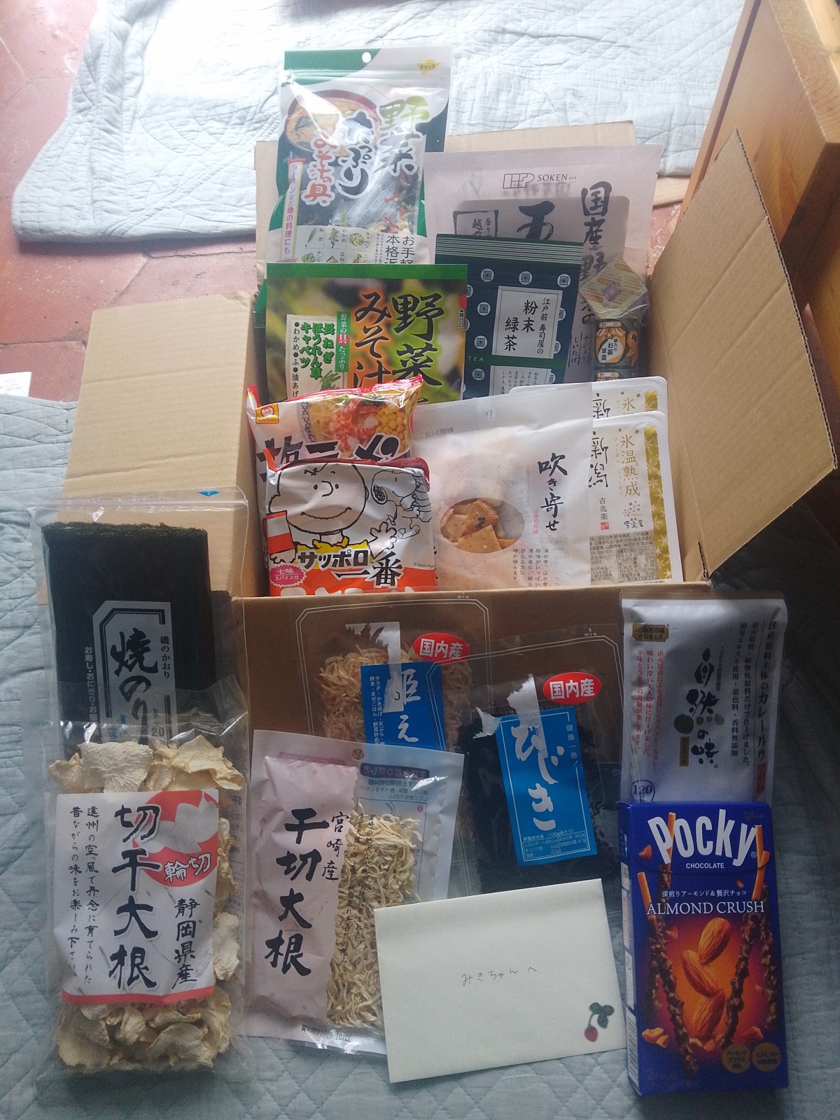 うれしいお手紙と豪華な日本食詰め合わせ! 輪切りの切り干し大根、初めて見たわ。どんな歯ざわりかな。