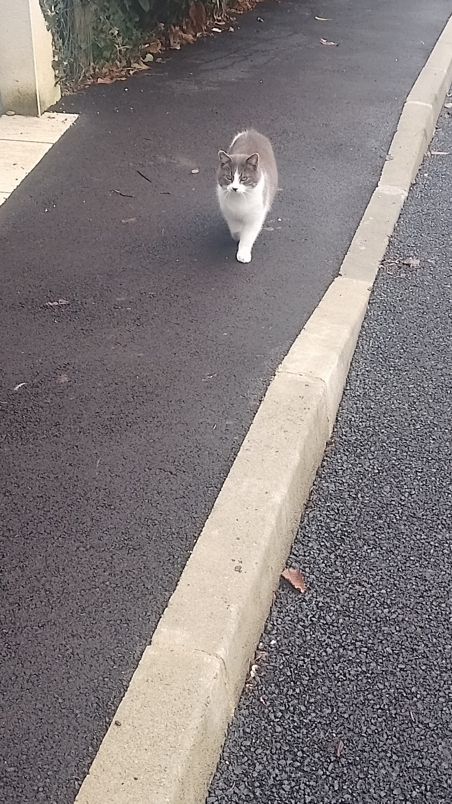 お家へお連れします 飼い主さんにすぐ電話をかけて、家の前に出てもらうよう手配するねーこです。自宅と隣の家の境あたりで、なわばりのおしっこかけとったわ。貴重な光景、何年ぶりかなあ!大家さんのだんなさんの車、ねーこの自転車にもかけたことあるわ。迎えに出た飼い主さんマダムにも報告しといたぞ。