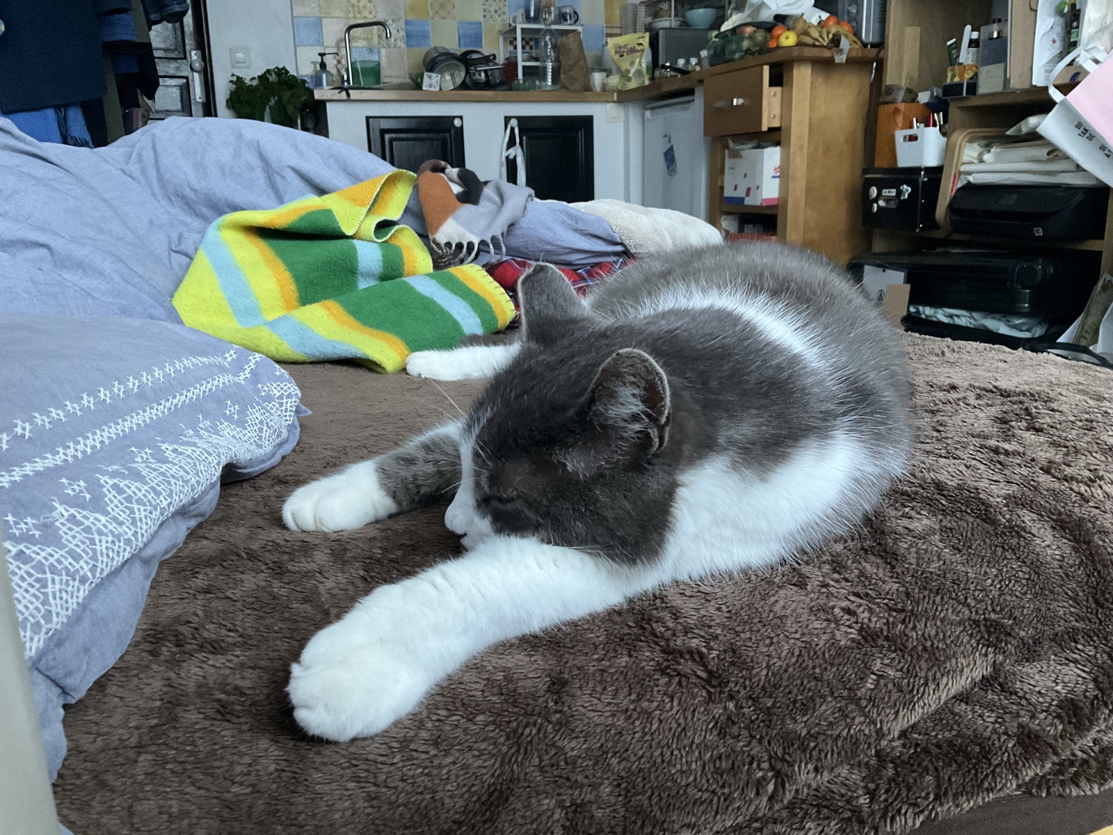 50分ほど椅子でおねむして、ねーこがさわったからか起きてもうた。のどを潤してからベッドで昼寝のつづき。黄色いカシミアのセーターをかけたげたよ。