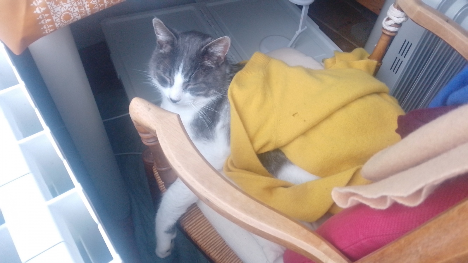 君臨しとるぞ。けんかの報告のメールの返事によると飼い主さん(マダム)のひざで昼寝したらしい。