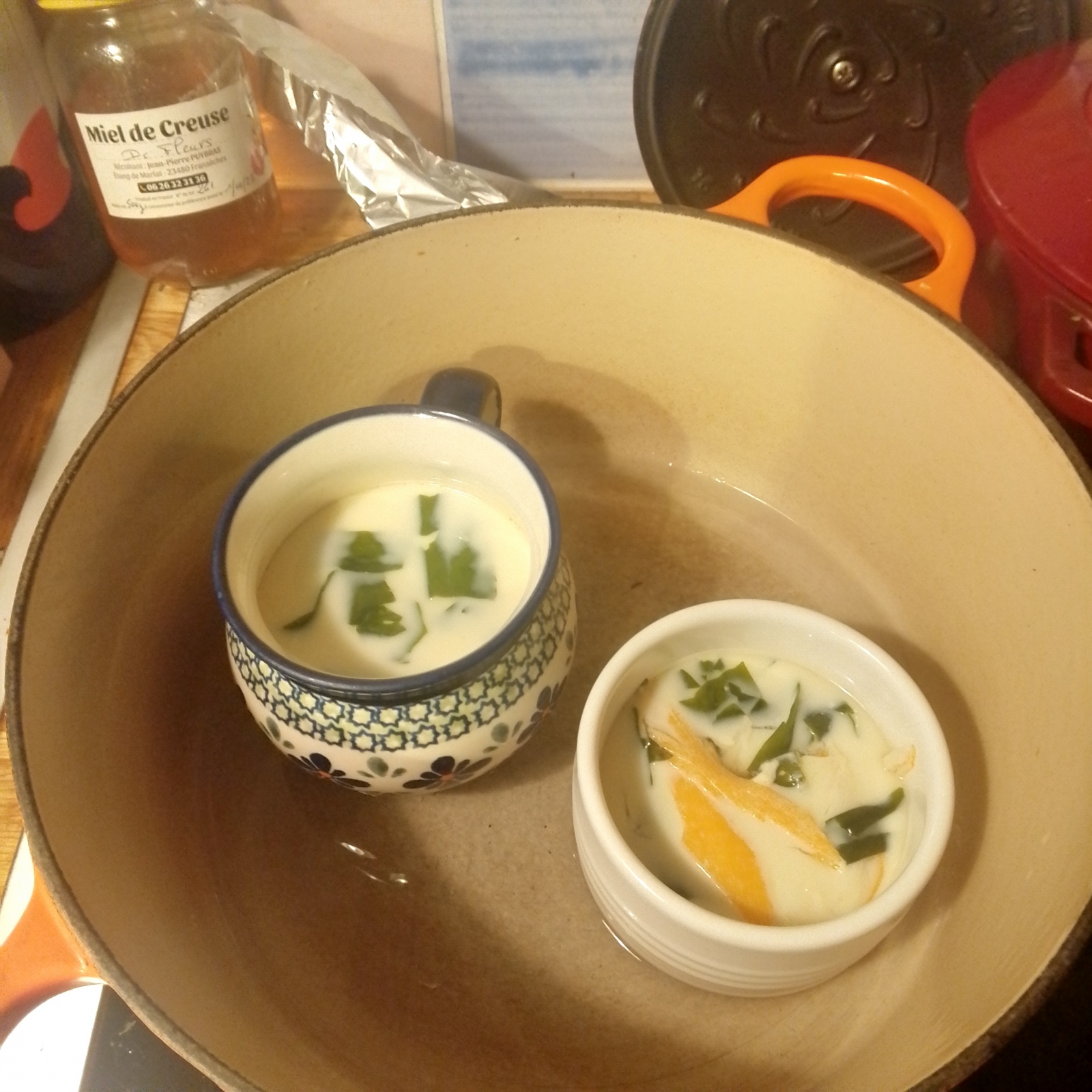 茶碗蒸し 初めて作ったと思うわ。煮沸できるはずのガラスの器は、ピシッとヒビがすぐ入ってもうた。左はポーランドのマグカップ、右はル・クルーゼ(鍋も)、どっちもオーブン対応です。もうちょっと味付け濃くても良かったかな。まあ、具がカニカマとわかめだけやからね。口当たりは上出来。