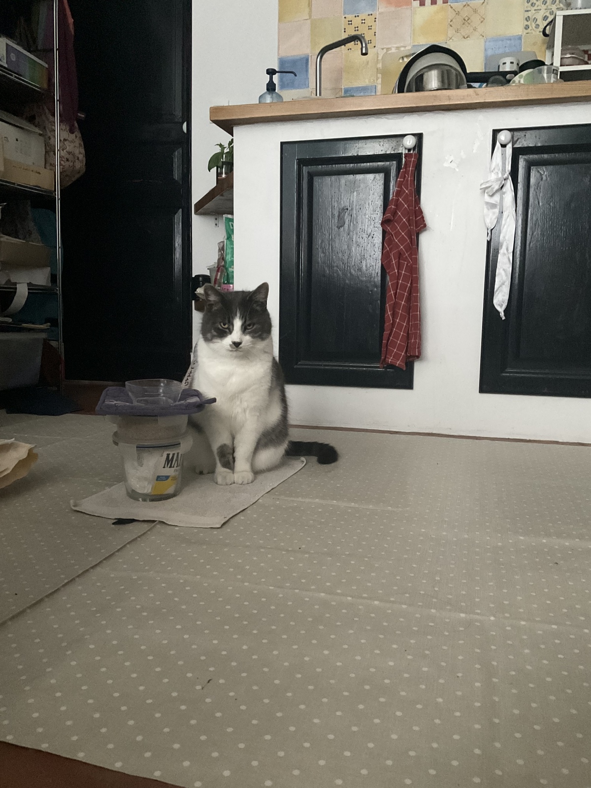 2月15日(日) 雪の中も領内見回り 9時台に外を見たら、猫千代がお勤めから帰るとこやった。目が合ったら来てくれたよ。ぬるま湯にペーストを入れたあったかスープでもてなします。しっぽが太かったと思う! 特別任務(例えば、よそ猫の侵入から帝国を守る)をしてきたとこやったんかな。