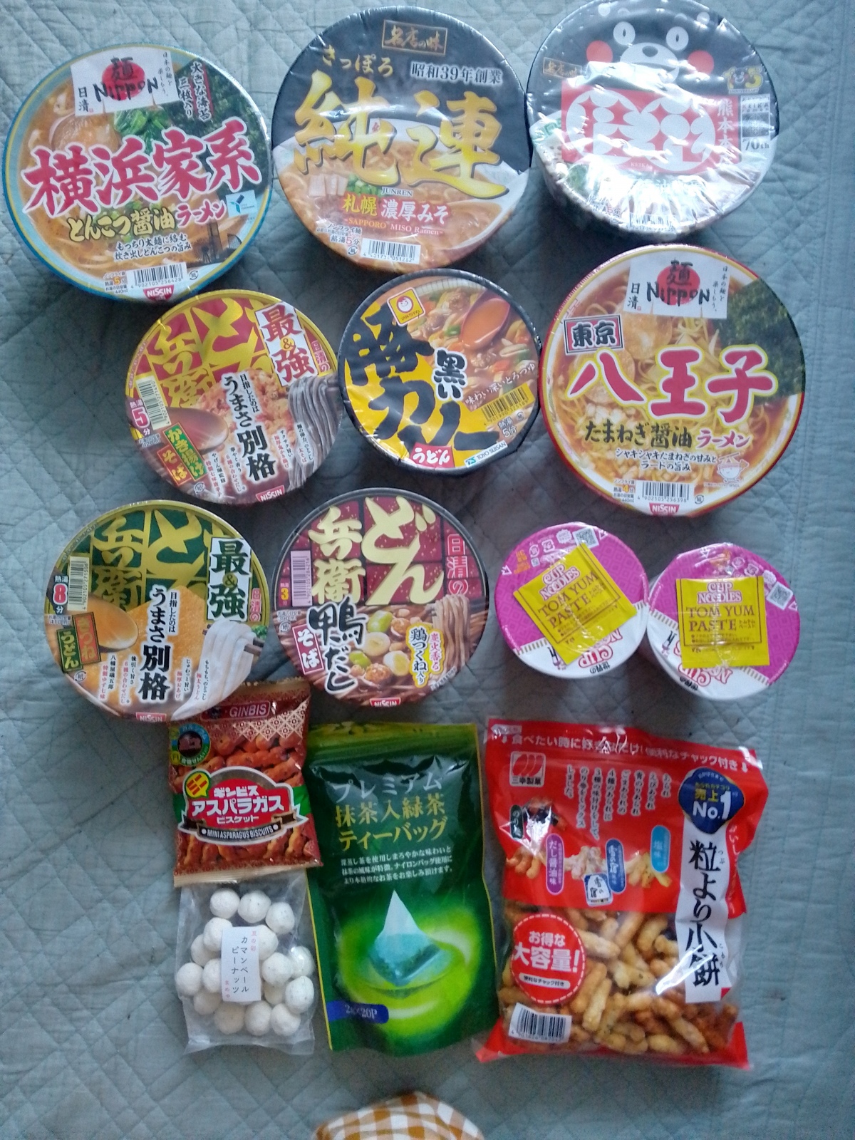 よりどりみどり 頼んだお荷物のほかにカップ麺10個、おやつとお茶ももらったよ。今日のお昼にさっそくどん兵衛のかき揚げそばを食べました。ちょっこしごはんを付けて。夏までラーメン買わんでいいかな。ありがたい!