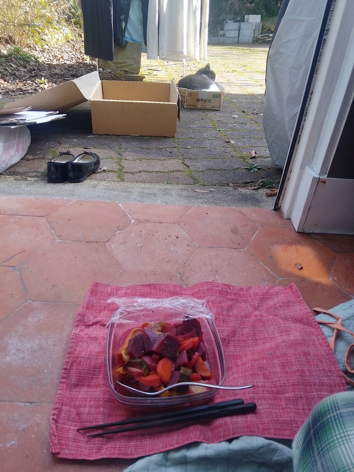 外に出て食べ始めたら、近づいてきたよ。そりゃ食べとるものが気になるよね。