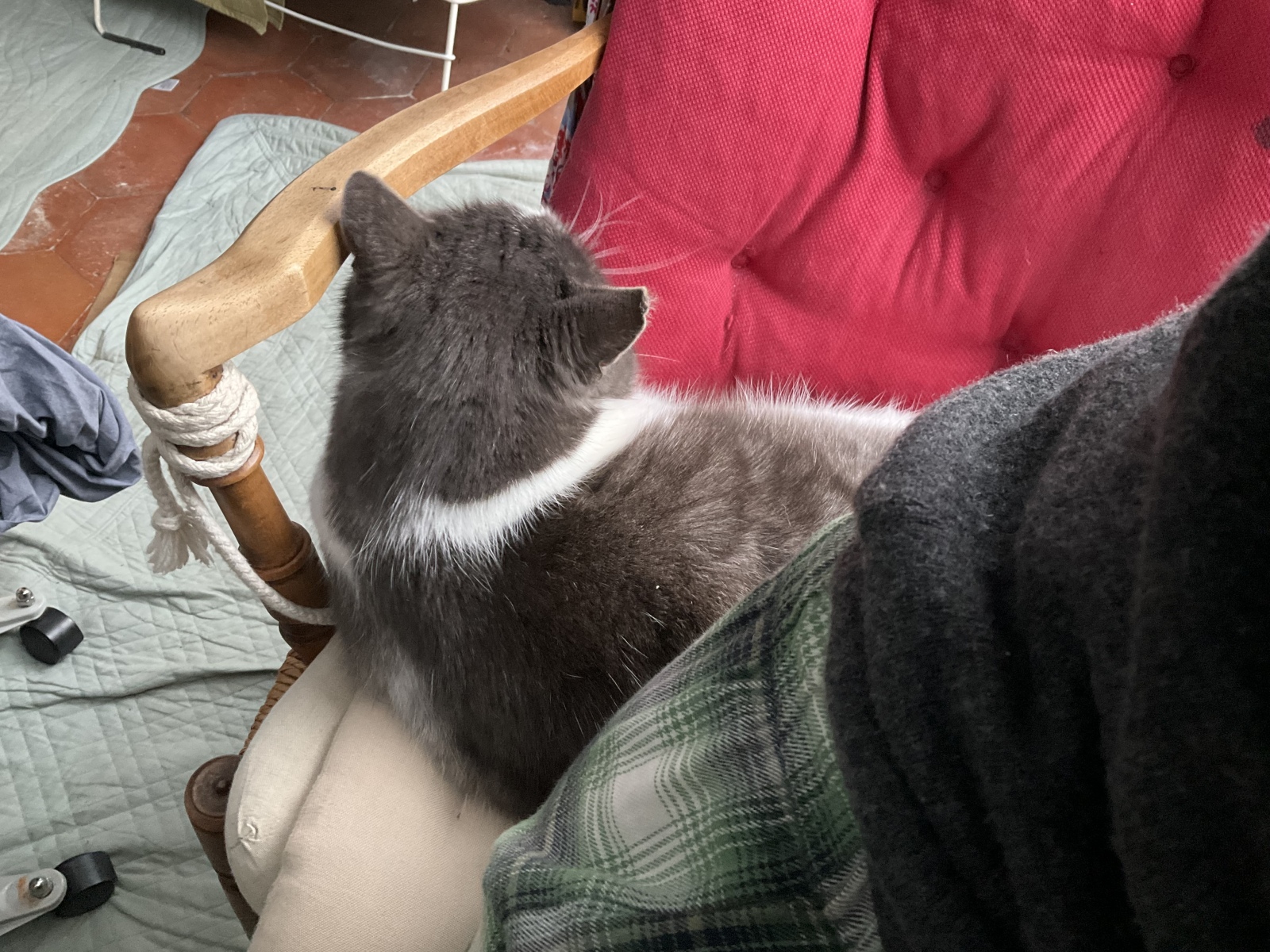 猫千代帝国の椅子のすきまに、おしり帝国をねじ込んだら、体を動かして場所を少し分けてくれたわ。