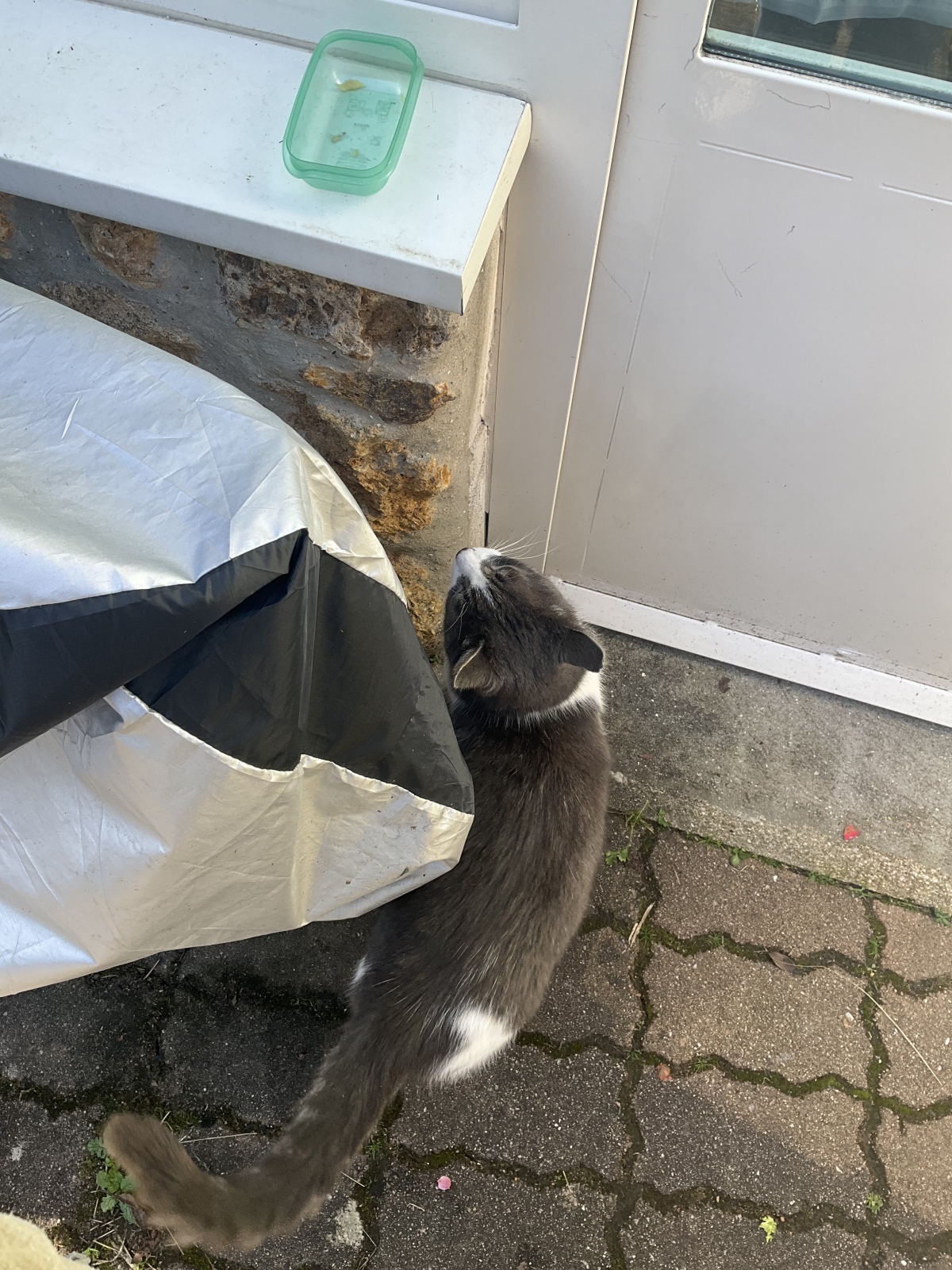 緑のタッパーは、出かける時に猫千代のおやつを入れてん。おやつ味わっとる間に、ぴゅーっと自転車で出発するよ。帰ってからここにタッパーを置いたというわけです。