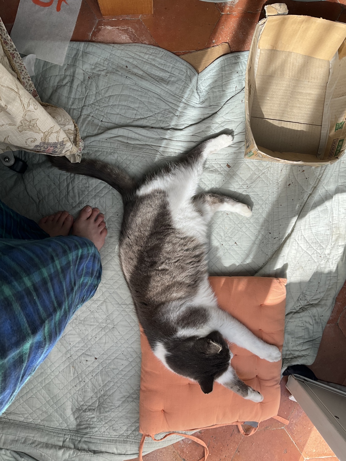 庭に出て戻ったら、通り道に伸びてくるしっぽちゃん。2回同じことしたのは偶然け? またぐのやーから、手でしっぽを寄せて通り道を確保したねーこです。