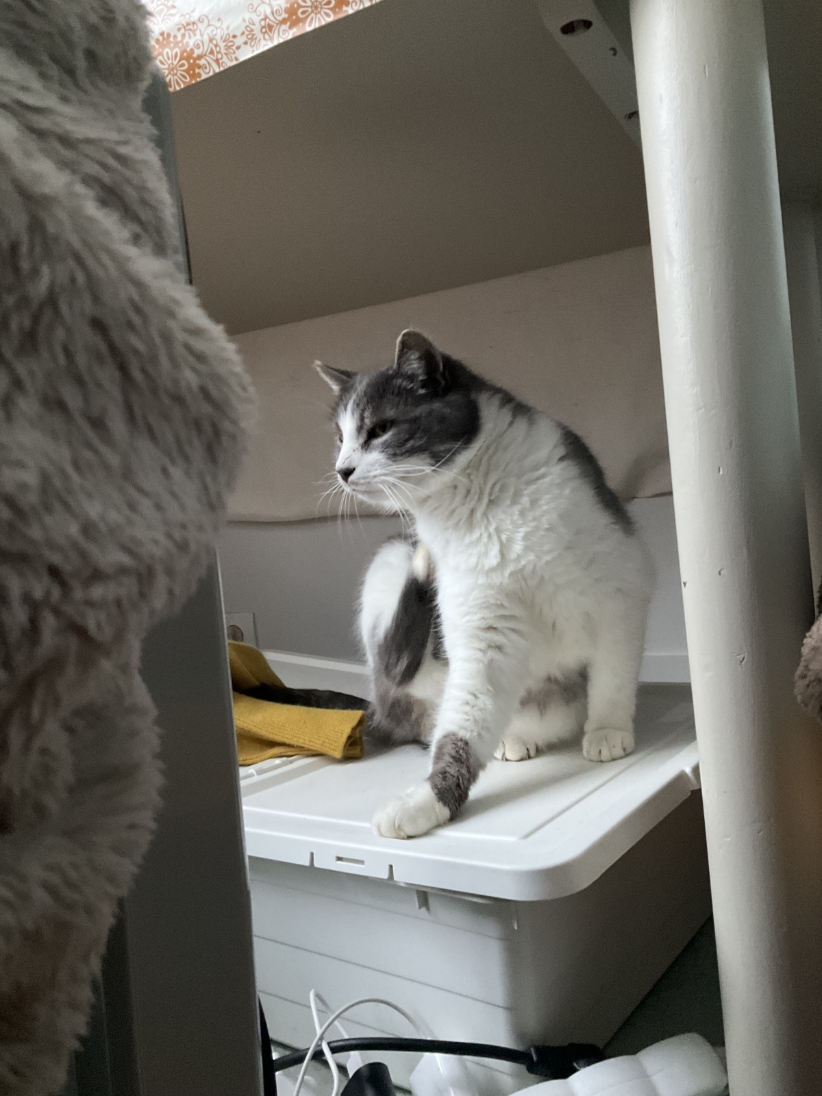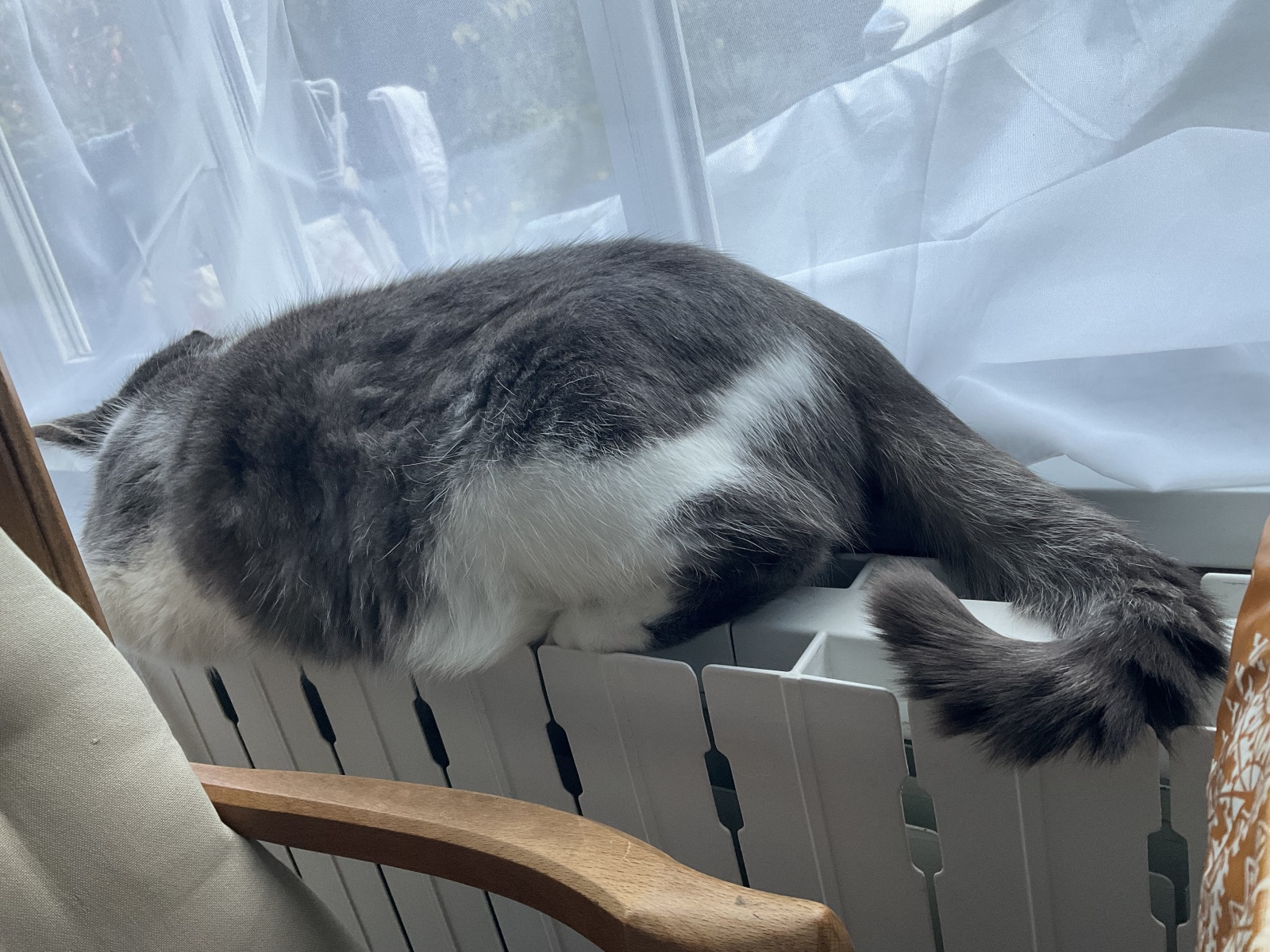 暖房の上。ねーこに顔を近付けられて、においをかがれる場所やぞ。